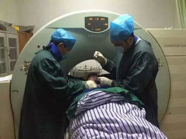 上縱隔是人體一個極其狹小的空間,卻包含有胸腺、出入心的大血管、 迷走神經(jīng)、膈神經(jīng)、氣管、食管、胸導(dǎo)管等重要氣管。要在這里進行穿刺并放置放射性粒子是一個高難度手術(shù),在我省醫(yī)學(xué)界也是前所未有的。此處是食道癌易于出現(xiàn)淋巴結(jié)轉(zhuǎn)移的部位。像劉叔叔這樣通過手術(shù)、放療、化療治療后無效的病人在此之前是沒有辦法繼續(xù)治療的。但是王貴華主任,是一位醫(yī)術(shù)精湛的腫瘤微創(chuàng)專家,面對幾乎不可能完成的任務(wù),他依然迎難而上,硬是把它拿下了。為確保手術(shù)成功,王貴華主任與他的團隊多次在CT圖像引導(dǎo)下模擬穿刺。經(jīng)過多次反復(fù)模擬成功后,在確保患者安全的情況下,終于成功正式實施手術(shù),手術(shù)非常順利。患者和家屬非常高興,對醫(yī)護人員贊不絕口。