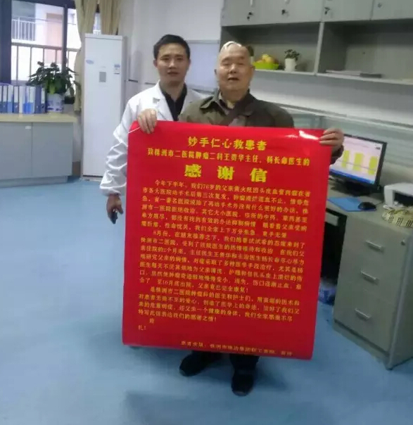 金秋十月,株洲市二醫(yī)院(株洲市腫瘤醫(yī)院)腫瘤二科出現(xiàn)了一幕感人的畫面:一位74歲的老爺爺手捧一封感謝信送給科室的醫(yī)護(hù)人員,引來其他患者紛紛圍觀。當(dāng)時(shí)只見黃爺爺緊緊握住王主任的手,熱淚盈眶:“株洲市二醫(yī)院腫瘤科的妙手丹心在我身上創(chuàng)造了醫(yī)學(xué)奇跡,幫我擺脫了惡瘤,早知道如此,我何苦輾轉(zhuǎn)求醫(yī)啊,真是萬分感謝!”王主任看著這位紅光滿面,面帶笑容的黃爺爺,入院時(shí)的情景立即浮現(xiàn)在他眼前。