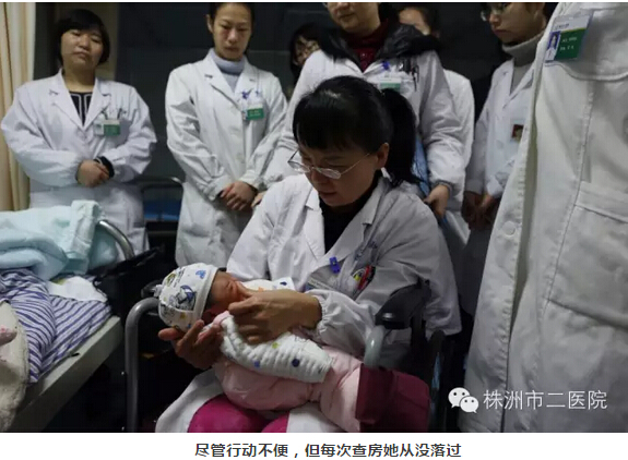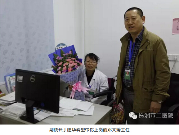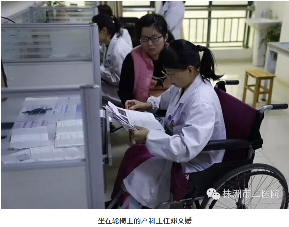 眼前這位左腿打著鋼板,卻還堅持坐在輪椅上為患者問診把脈的醫(yī)生鄧文媛,是株洲市二醫(yī)院產(chǎn)科主任。前段時間,她因外傷導(dǎo)致左腿骨折,按照常理她應(yīng)當(dāng)在家休息至少一個月,但為了讓每一位準(zhǔn)媽媽如約順利就診,她放棄了休養(yǎng),帶傷堅持上崗。這種對職業(yè)的尊重和執(zhí)著,贏得了同事和患者們的贊揚。