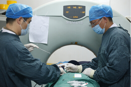 在B超或CT引導(dǎo)下,皮膚局麻后經(jīng)皮膚麻醉點(diǎn)將氬氦刀準(zhǔn)確穿刺至腫瘤部位進(jìn)行冷凍治療。