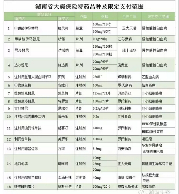 湖南省大病保險(xiǎn)特藥品種及限定支付范圍