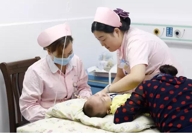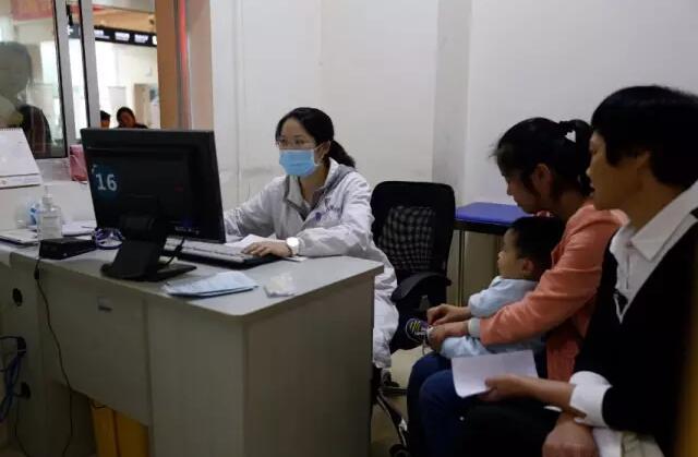 兒科門(mén)診前,前來(lái)就診的患者就一波接一波,當(dāng)班的醫(yī)生在給一患兒做檢查、開(kāi)藥,護(hù)士也在忙著照顧這些小患者。