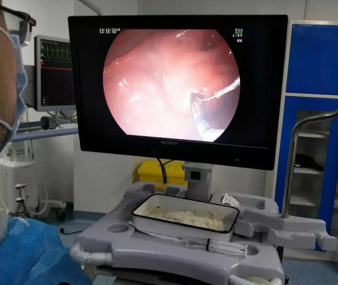 隨著湯主任嫻熟操作,十二指腸鏡順利地從口中探入,經(jīng)過食道、胃、十二指腸,成功到達(dá)十二指腸和膽管的交會處,隨即在膽管連接腸道的乳頭上切開一公分長的口子,隨即內(nèi)鏡通道中伸出一根像鉛筆芯大小的金屬探頭,沿乳頭切開的口子,順著膽道,直達(dá)結(jié)石部位。通過內(nèi)鏡的觀察,電子屏上顯示一個大約2公分大小的結(jié)石正卡在何先生膽總管的下段。