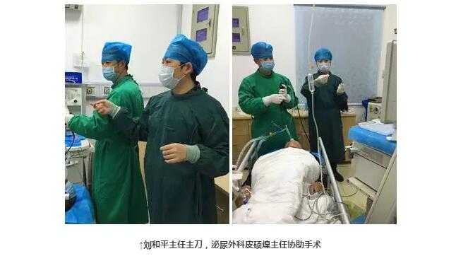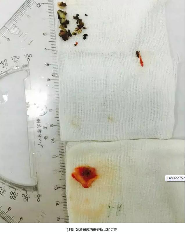 經(jīng)過呼吸內(nèi)科劉和平主任醫(yī)師及介入小組成員的初步診斷,李大爺左側(cè)肺里的骨性異物堵住了一支支氣管的開口,且被大量肉芽組織嚴(yán)嚴(yán)實(shí)實(shí)地包裹著,經(jīng)常規(guī)電燒及冷凍,無法使其分離,如果強(qiáng)行拖出恐有大出血風(fēng)險(xiǎn),為了克服這一難題,劉主任在組織了科內(nèi)討論及多學(xué)科會診,并查閱了大量資料,最終決定用鈥激光先將異物擊碎分離成多個,再分次清除的辦法,這種取異物的方法鮮有報(bào)道。經(jīng)討論組建多學(xué)科協(xié)同合作的MDT團(tuán)隊(duì)與患者共渡難關(guān)。就這樣,先是麻醉科行喉罩通氣,為生命體征的平穩(wěn)保駕護(hù)航,然后由劉和平主任主刀,泌尿外科皮碩煌主任等協(xié)助,利用鈥激光成功將異物擊碎并分次取出,手術(shù)歷時二個多個小時,患者生命指標(biāo)平穩(wěn)。