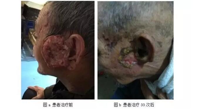 2015年11月我科收治一位七十多歲的老年皮膚癌患者,當時患者及家人都準備放棄治療,該患者2012年無意間發(fā)現(xiàn)左側顏面部一黃豆大小腫塊,局部無疼痛、無破潰、未予重視,隨著時間的推移,腫塊進行性增大至手掌大小,伴疼痛,瘙癢,但仍未系統(tǒng)就診,2015年10月腫塊無明顯誘因的情況下出現(xiàn)破潰出血,伴疼痛加重,嚴重影響進食睡眠,生活質(zhì)量非常差,氣味極度難聞,周圍的人都不愿靠近他,老人家因為自身的腥臭味盡量遠離人群,少言寡語,情緒低落,家人也愁得不知該如何是好,實在沒有辦法,抱著試試的態(tài)度來到我們醫(yī)院,腫瘤科王主任把患者帶到我科時,患者的精神狀態(tài)非常差,治療前腫塊的圖片如圖a,經(jīng)過我們?nèi)畏暖熂澳[瘤科王主任團隊的精心處理護理后,患者情況如圖b: