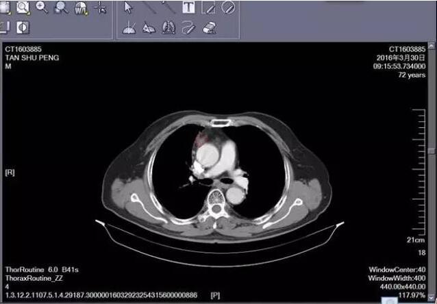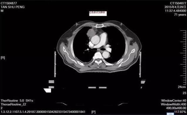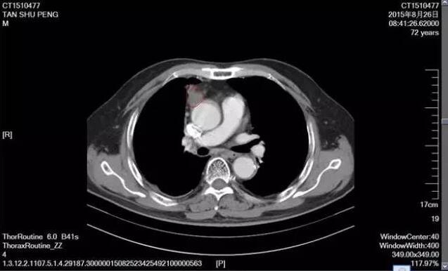 下面這張是2015年8月份復查的CT片,腫塊開始縮小,放療完畢患者一般狀況可,期間曾出現(xiàn)過輕度放射性食道炎,經(jīng)對癥處理,患者基本恢復,無特殊不適。