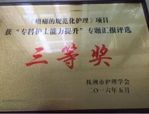 在院領(lǐng)導(dǎo),護(hù)理部及腫瘤科全體醫(yī)務(wù)人員的努力下,我院腫瘤??频玫搅苏?、社會(huì)各界各級(jí)領(lǐng)導(dǎo)的高度關(guān)注,社會(huì)癌癥病友的高度信任,腫瘤專科得以高速發(fā)展,是株洲市第一批“癌痛規(guī)范化治療示范病房”。