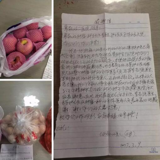 故事要從1周前說(shuō)起,年近八十歲的譚奶奶前后兩次提著自家的土雞蛋、蘋(píng)果并帶來(lái)一封感謝信來(lái)到腫瘤一科。當(dāng)班的醫(yī)護(hù)人員執(zhí)意不肯收譚奶奶的禮物,譚奶奶說(shuō),我今天是代表我女兒特意來(lái)感謝腫瘤1科全體醫(yī)護(hù)人員,本來(lái)要和女兒早點(diǎn)來(lái),但女兒一直沒(méi)有從失去兒子的悲痛走出來(lái),所以我專(zhuān)程一個(gè)人來(lái),感謝你們了。我的小外孫雖然在與腦膜瘤抗?fàn)巸赡?,仍不幸去世,但在小外孫住院期間,腫瘤1科的醫(yī)護(hù)人員給小外孫無(wú)微不至的關(guān)懷和照顧,把小外孫當(dāng)作自已的親人,讓他在這世界的最后兩年感受無(wú)限的溫暖和呵護(hù),我們?nèi)覠o(wú)比感謝腫瘤1科醫(yī)護(hù)人員,你們的大恩大德,我們家人永世難忘。