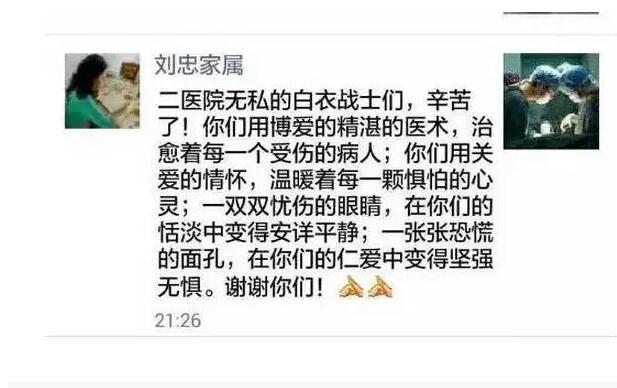 劉忠是一位肺癌晚期患者,近日,他的家屬在微信朋友圈發(fā)了一條真誠感謝的微信。微信是這樣寫的,二醫(yī)院無私的白衣戰(zhàn)士們,你們辛苦了!你們用博愛的精湛的醫(yī)術(shù),治愈每一個受傷的患者,你們用關(guān)愛的情懷,溫暖著每一顆懼怕的心靈:一雙憂傷的眼晴,在你們的恬淡中變得安詳平靜:一張張恐慌的面孔,在你們的仁愛中變得堅(jiān)強(qiáng)無懼。